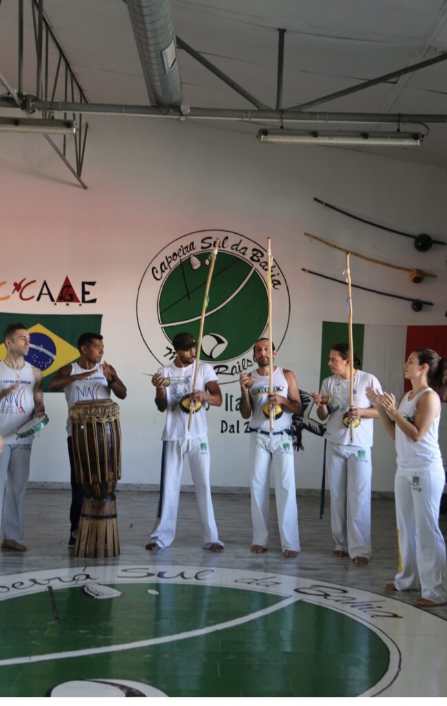 Durante gli allenamenti i praticanti imparano a riconoscere il ritmo del berimbau, lo strumento che guida la roda. Canti tradizionali e battiti di mani accompagnano il gioco, creando un’atmosfera che rende la capoeira diversa da molte altre attività sportive.